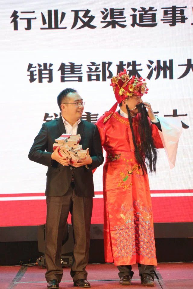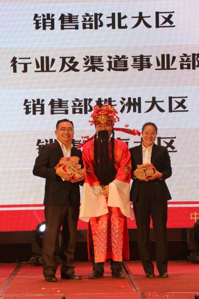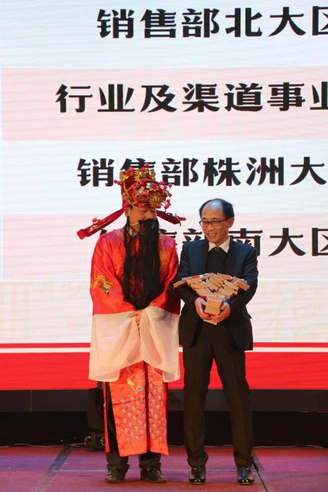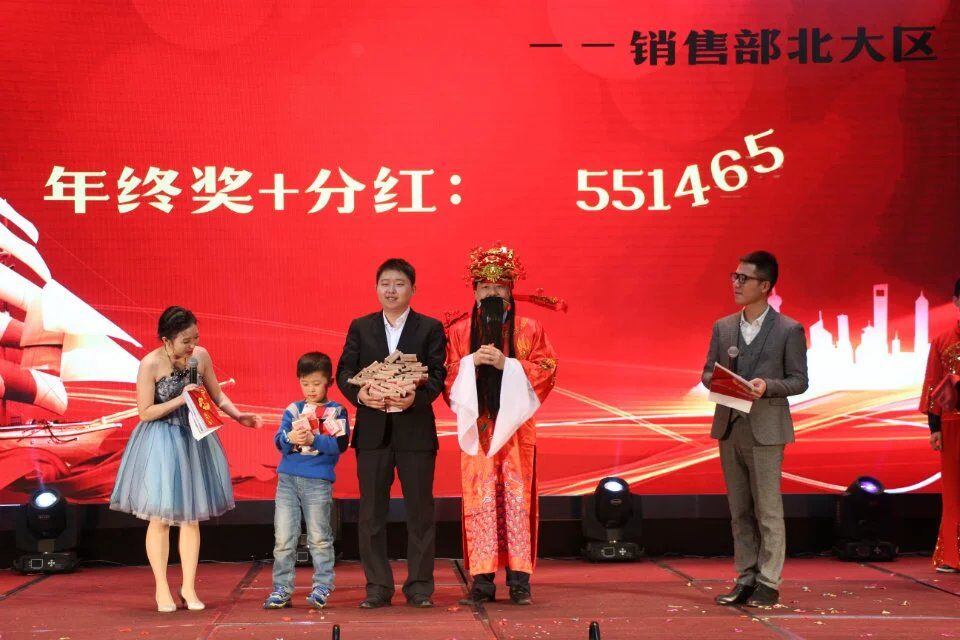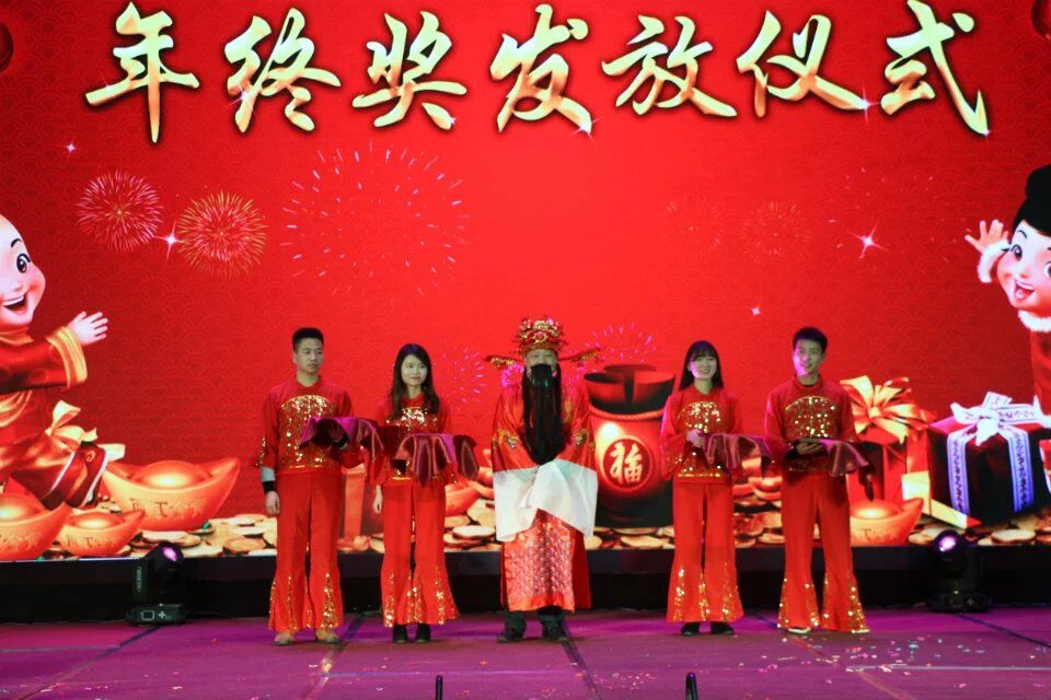 接下來,最期待、最歡快的環(huán)節(jié)來了——年終獎發(fā)放儀式。何總裝扮成財神爺?shù)哪樱瑤е膫€童子歡樂登場!