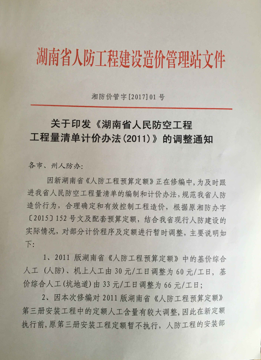 湖南省人防工程建設(shè)造價(jià)管理站于2017年1月1日發(fā)布了湘防價(jià)管字[2017]01號(hào)關(guān)于印發(fā)《湖南省人民防空工程工程量清單計(jì)價(jià)辦法(2011)》的調(diào)整通知。湖南人防定額全面實(shí)施營(yíng)改增,現(xiàn)智多星工程項(xiàng)目造價(jià)管理軟件已同步更新?,F(xiàn)將相關(guān)升級(jí)事宜規(guī)定如下: