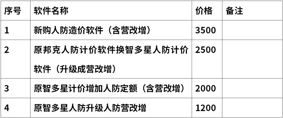 三、 收費(fèi)說(shuō)明:人防軟件銷售價(jià)格及升級(jí)人防營(yíng)改增價(jià)格如下:
