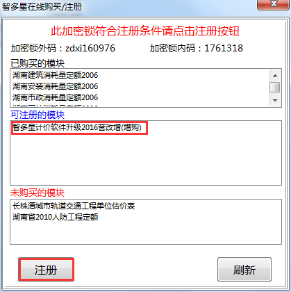 第三步:在彈出的窗口中,系統(tǒng)會(huì)自動(dòng)檢測(cè)該加密鎖是否符合自助升級(jí)的條件,如符合條件,系統(tǒng)會(huì)將可注冊(cè)升級(jí)的模塊全部羅列展示出來(lái):